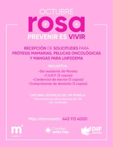 El DIF Morelia, que encabeza la Presidenta Honoraria, Paola Delgadillo Hernández, ha abierto la recepción de solicitudes para la entrega gratuita de prótesis mamarias, pelucas oncológicas y mangas para linfedema durante el mes de octubre, con el objetivo de apoyar a las mujeres que han superado o están en tratamiento contra el cáncer de mama.