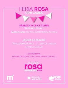 El DIF Morelia, que encabeza la Presidenta Honoraria, Paola Delgadillo Hernández, invita a las familias morelianas a participar en la Feria Rosa con causa, que se llevará a cabo el sábado 19 de octubre a partir de las 10:00 a.m. en el Parque Lineal del Boulevard García de León, como parte de la campaña Prevenir es Vivir “Tu salud importa más” por el Día Mundial de la Lucha contra el Cáncer de Mama.