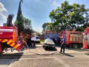 Morelia, Mich.- Martes 05 de noviembre de 2024.- Elementos de la Policía Morelia ayudaron a sofocar un incendio que se registró en un taller de hojalatería y mecánica automotriz ubicado en la colonia Vicente Guerrero, en la zona poniente de la ciudad, trascendió en la cobertura de la noticia.