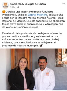 Morelia, Michoacán a 14 de enero de 2024.- Las Fiscalía General del Estado (FGE), dio a conocer que el presidente municipal de Charo, Gabriel Molinero, mintió en una publicación realizada en la fan page oficial de Facebook de ese Ayuntamiento, solo fue un saludo.