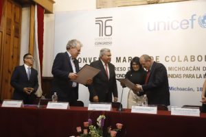Morelia, Michoacán, a 18 de marzo de 2025.- El Congreso del Estado signó un convenio de colaboración con la oficina en México de la Naciones Unidas para la Infancia UNICEF con el compromiso de trabajar en favor de las niñas, niños y adolescentes de Michoacán, en acciones que permitan contar con una mejor legislación, pero también en la generación de mejores políticas públicas.