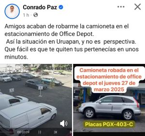 Uruapan, Mich.- 27 de marzo de 2025.- Delincuentes robaron la camioneta del Diputado Local, Conrado Paz, del estacionamiento de la tienda Office Depot, sobre el Paseo Lázaro Cárdenas de Uruapan, hechos ocurridos la mañana de este jueves.