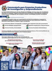 Morelia, Michoacán, a 13 de abril de 2025.- Por segundo año consecutivo la administración de la rectora de la Universidad Michoacana de San Nicolás de Hidalgo (UMSNH), Yarabí Ávila González, lanzó la convocatoria para que estudiantes de licenciatura y bachillerato de la institución participen con proyectos de investigación y de emprendedorurismo que busquen resolver necesidades sociales.