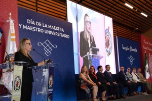 Frente al profesorado y flanqueada por integrantes del gabinete, la rectora agradeció a cada una de las maestras y de los maestros que hoy reciben esta distinción por su entrega silenciosa, por su constancia diaria, por su paciencia infinita y por su amor al conocimiento y a sus estudiantes. Este dijo, no es un acto simbólico, es un acto de justicia porque su trabajo ha transformado vidas, ha abierto caminos y ha sembrado el futuro.