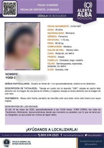 Se trata de Yoisi C., de 28 años de edad, ella fue vista por última vez con vida en la citada fecha y lugar, alrededor de las 10:00 horas, desde entonces se desconoció su pradero y sus familiares reportaron la situación el día 21 de mayo ante la Fiscalía General del Estado (FGE), la cual emitió una Alerta Alba con foto y características físicas de la susodicha.