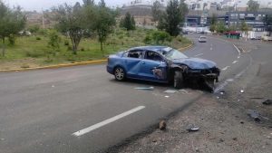 Uno de los percances tubo lugar sobre el camino al Recinto Ferial, cerca de Ciudad Salud. Se trató de la volcadura de un automóvil azul de la marca Volkswagen Jetta, cuyo ocupante resultó levemente lastimado.