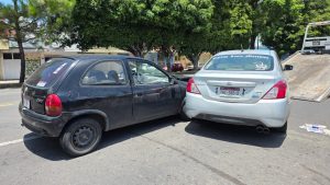 El aparatoso accidente tuvo lugar sobre la Avenida Juárez a la altura de la antigua gasolinera, donde colisionaron un auto Nissan Versa, de color gris, con placas PHC-585-B y un vehículo Chevrolet Chevy de color negro, con matrícula PHL-798-E.