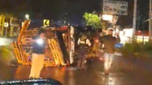 Se presume que el peso excesivo del cargamento y las malas condiciones del vehículo influyeron en el incidente. En el sitio se presentaron patrulleros municipales, quienes abanderaron el incidente y realizaron el peritaje correspondiente, después solicitaron una grúa, la cual retiró la unidad siniestrada.