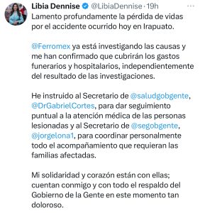 La gobernadora de GuanajuatoLibia García, informó que dio instrucciones para brindar apoyo a las familias. El secretario de Salud, Gabriel Cortés, dará seguimiento a la atención médica, y el secretario de Gobierno, Jorge Lona, coordinará el acompañamiento institucional.
