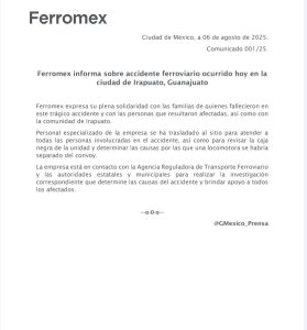 En un comunicado, Ferromex informó que personal especializado fue enviado al sitio para revisar la caja negra del tren, colaborar con las autoridades y atender a las personas afectadas. También confirmó que cubrirá los gastos funerarios y hospitalarios de las víctimas, independientemente del resultado de las investigaciones.