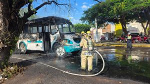 Zamora, Mich.- 19 de septiembre de 2025.- La tarde de este viernes, un camión de pasajeros ardió en llamas en el Infonavit Arboledas Tercera Sección de la ciudad de Zamora. En el lugar de los hechos varias personas informaron que desconocidos en motocicleta provocaron el incendió, sin embargo, el departamento de comunicación social del ayuntamiento local refiere que se trató de un cortó circuito.