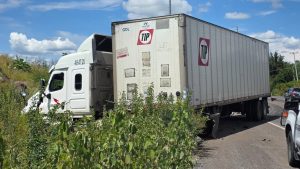 Trascendió que las unidades involucradas en el percance son un automóvil Nissan, Versa, de color guinda, con placas PPY-901-C y un tráiler de color blanco, cuyo conductor fue requerido.