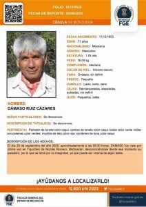 Tiquicheo, Mich.- Miércoles 01 de octubre de 2025.- El senderista Dámaso Ruiz Cázares, de 71 años de edad, fue visto por última vez el pasado 29 de septiembre en la cabecera municipal de Tiquicheo y desde entonces se desconoce su paradero. Policías y elementos de la Coordinación Estatal de Protección Civil Michoacán (CEPCM) emprendieron un operativo de búsqueda para encontrar al susodicho.