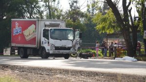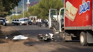 Jacona, Mich.- 14 de octubre de 2025.- El choque entre un camión repartidor de la empresa de lácteos «Lala» y una motocicleta, dejó como saldo a un adulto mayor sin vida y cuantiosos daños materiales, en esta demarcación de Jacona.