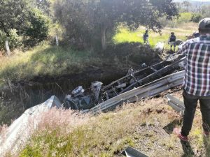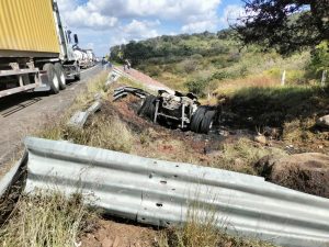 Se apreció los dos remolques de la unidad quedaron atravesados, en tanto que la cabina cayó a un desnivel donde se incendió por completo y el conductor alcanzó a salira tiempo. Posteriormente arribaron socorristas y bomberos municipales, éstos últimos sofocaron la lumbre.