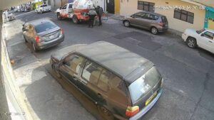 Morelia, Mich.- Jueves 05 de febrero de 2026.- Una cámara de videovigilancia captó el momento exacto cuando dos sujetos que viajaban a bordo de una motocicleta presuntamente asaltaron a un trabajador de la empresa gasera «ServiGas», delito registrado en la colonia moreliana Ventura Puente.