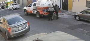 Los individuos se aproximan al empleado, quien se encontraba en la parte posterior de una camioneta pipa, pendiente del abastecimiento de gas en un domicilio. Los dos hombres hostigando al repartidor, cruzan algunas palabras con él y éste último les entrega algo a los sospechosos —posiblemente dinero—, tras lo cual se retiran del lugar.