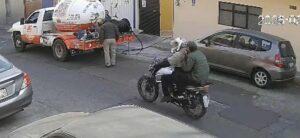 Morelia, Mich.- Jueves 05 de febrero de 2026.- Una cámara de videovigilancia captó el momento exacto cuando dos sujetos que viajaban a bordo de una motocicleta presuntamente asaltaron a un trabajador de la empresa gasera «ServiGas», delito registrado en la colonia moreliana Ventura Puente.