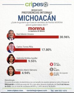 Raúl Morón Orozco se perfila para ser el coordinador estatal de Defensa de la 4T en Michoacán, al registrar una ventaja de 2 a 1 en las preferencias sobre su más cercano rival, Carlos Torres Piña, de acuerdo a la encuesta más reciente de la firma Cripeso.