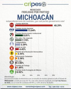En cuanto a la fidelidad por partido, Morena arrasa con un 48.29% de intención de voto, superando por más de 30 puntos al PAN (15.64%) y dejando al PRI en un lejano tercer puesto con apenas el 8.81%.