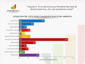 Morelia, Michoacán, 2 marzo de 2026.- La más reciente encuesta de Datamétrica confirma que Juan Carlos Barragán es el perfil más fuerte de Morena y el único que ganaría la presidencia municipal de Morelia.