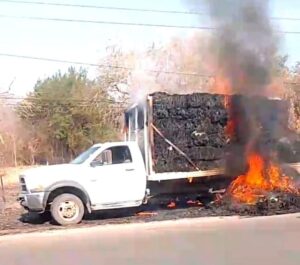 Huetamo, Mich.- Jueves 12 de marzo de 2026.- Una camioneta con plataforma se incendió durante la tarde de este jueves sobre la carretera Huetamo–San Lucas, informaron autoridades policiales y de rescate, las cuales agregaron que el siniestro se generó debido a una falla mecánica.
