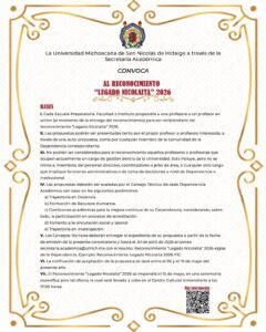 Morelia, Michoacán, a 22 de marzo de 2026.- Por tercer año consecutivo, la administración de la rectora de la Universidad Michoacana de San Nicolás de Hidalgo (UMSNH), Yarabí Ávila González, entregará el Reconocimiento “Legado Nicolaita” a las profesoras y profesores que han destacado en el cumplimiento de las funciones sustantivas de la casa de estudios.