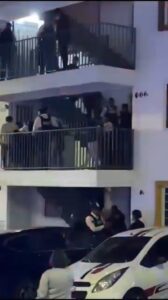 En otro material videográfico se aprecia el momento en que patrulleros municipales ya se encuentran en el lugar, tienen asegurados a los sospechosos y los escoltan por los pasillos del edificio para bajarlos y subirlos a las unidades.